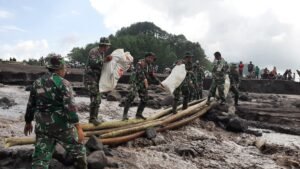 Lumajang — Setelah jembatan darurat di Sungai Regoyo sukses dibangun sebagai akses utama evakuasi, prajurit Kodim 0821/Lumajang langsung bergerak cepat memastikan warga dapat melintas dengan aman. Pada Senin (8/11/2025), Peltu Erwin Setyo bersama personel TNI lainnya turun langsung mendampingi proses penyebrangan warga terdampak banjir lahar dingin di Dusun Sumberlangsep, Desa Jugosari, Kecamatan Candipuro.