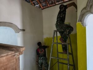 Di sebuah rumah sederhana di Dusun Ngepreng, prajurit Satgas TMMD Ke-127 Kodim 0819/Pasuruan tampak mengecat dinding rumah. Satu prajurit berdiri di atas tangga menjangkau plafon, sementara rekannya menyiapkan cat kuning Avitex dari ember. Suasana ruangan terasa hidup dengan aroma cat segar setelah hujan semalam di Desa Wonosari, Kecamatan Gondangwetan, Kabupaten Pasuruan, Minggu (8/3/2026).