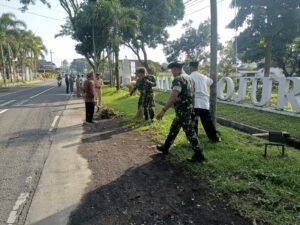 **SINGOJURUH** – Upaya mendukung program peluncuran Banyuwangi Asri diwujudkan melalui kegiatan kerja bakti yang digelar di depan Kantor Kecamatan Singojuruh, Kabupaten Banyuwangi, Rabu (18/2/2026) pagi.
