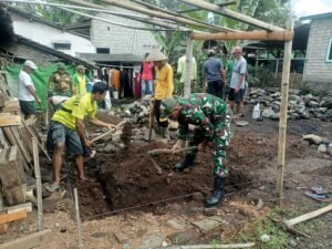 Singojuruh, Banyuwangi – Anggota Koramil 0825/13 Singojuruh ikut berbaur gotong royong membantu warga membuat pondasi rumah di Desa Singojuruh, pada hari ini.