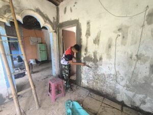 Di depan rumah yang tengah direnovasi, Muklis menyaksikan dengan haru perubahan rumahnya. Dinding yang dulu retak kini sudah diplester rapi, kusen pintu terpasang kokoh, dan teras mulai rata dengan semen segar. Program RTLH TMMD Ke-127 hampir selesai.