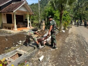 Lebakharjo – Program TNI Manunggal Membangun Desa (TMMD) ke-126 Tahun Anggaran 2025 terus menunjukkan perkembangan positif di wilayah Desa Lebakharjo, Kecamatan Ampelgading, Kabupaten Malang. Salah satu sasaran fisik yang dikerjakan oleh Satgas TMMD dari TNI Angkatan Udara (Lanud Abd. Saleh) adalah pembuatan drainase sepanjang 245 meter di Dusun Krajan 1B RT 16/RW 7.