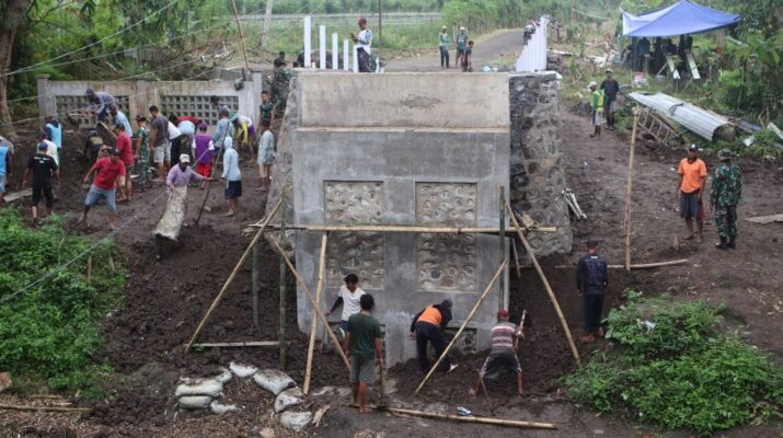 BANYUWANGI – Progres pembangunan jembatan penghubung desa dalam program TNI Manunggal Membangun Desa (TMMD) ke-125 oleh Kodim 0825/Banyuwangi mulai menunjukkan hasil yang signifikan. Pekerjaan