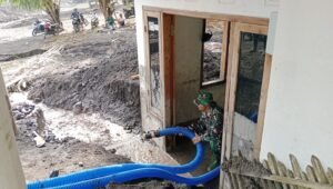Pembersihan dilakukan di beberapa rumah yang terdampak paling parah, di mana material lahar dingin berupa lumpur pekat masuk hingga ke dalam ruangan dan merusak perabotan warga. Dengan menggunakan selang bertekanan, Serda Samsul bersama warga menggelontor lantai, dinding, dan halaman rumah agar kembali layak ditempati.